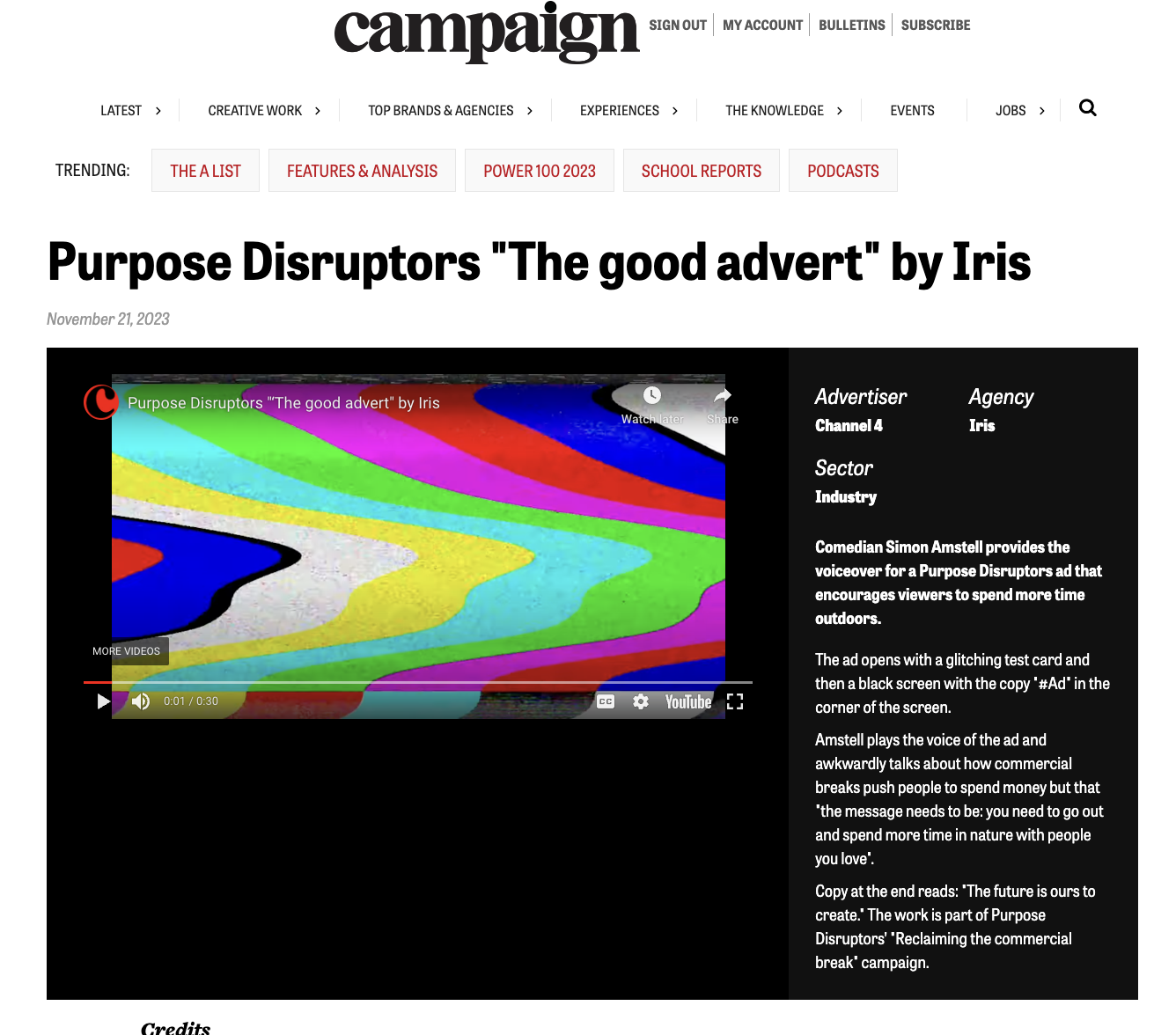The 30-second film featured comedian and writer Simon Amstell playing the part of ‘the advert’ with his trademark wit and irreverence. ‘The Good Advert’ was the latest execution of Purpose Disruptors’ ‘Reclaiming the Commercial Break’ multichannel campaign, created with Iris, supported with media strategy by MG OMD, which launched on Earth Day 2023. The campaign saw traditional advertising spaces in the UK - including the TV, cinema screens and the iconic Piccadilly Lights - subvert traditional advertising messages to bring home the reality that advertising and consumption of material things distract from what’s important in life.