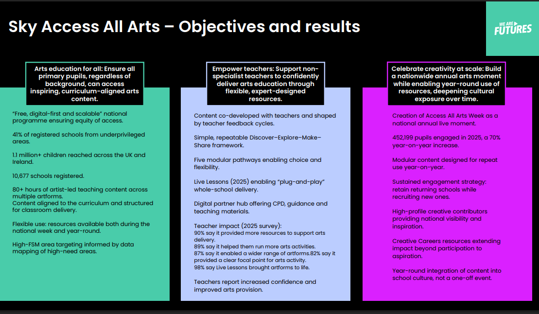Sky Arts partnered with We Are Futures to create Access All Arts. A free, national, long-term initiative tackling the systemic decline of arts education in UK primary schools. Designed to address deep inequality in access to creative opportunities, the programme responds to evidence that children from wealthier families are over three ...